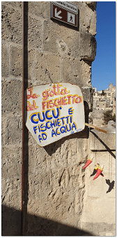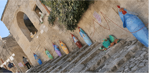 Girando tra i sassi è facile trovare installazioni di artisti, famosi e non, che espongono le loro opere. Durante il mio soggiorno c’era l’esposizione ”Segni e Sogni” 100 galline in terracotta policroma della pittrice, scultrice, ceramista Francesca Pastore