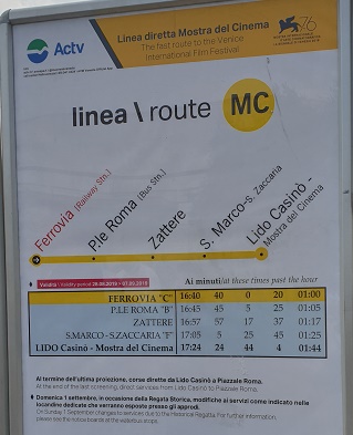 Per rientrare dal Lido (o per andare ma solo se arrivate dopo le 16,30) durante tutta la durata della mostra c’è la linea MC dedicata, in partenza direttamente dalla Mostra del Cinema. L’imbarco è a circa 300 metri sulla destra del Palazzo del Casinò