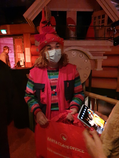 I piccoli elfi si nascondono fra i pacchetti e appena entri ti accolgono e ti presentano a Babbo Natale, che a sua volta è seduto su una grande sedia circondato dai regali.